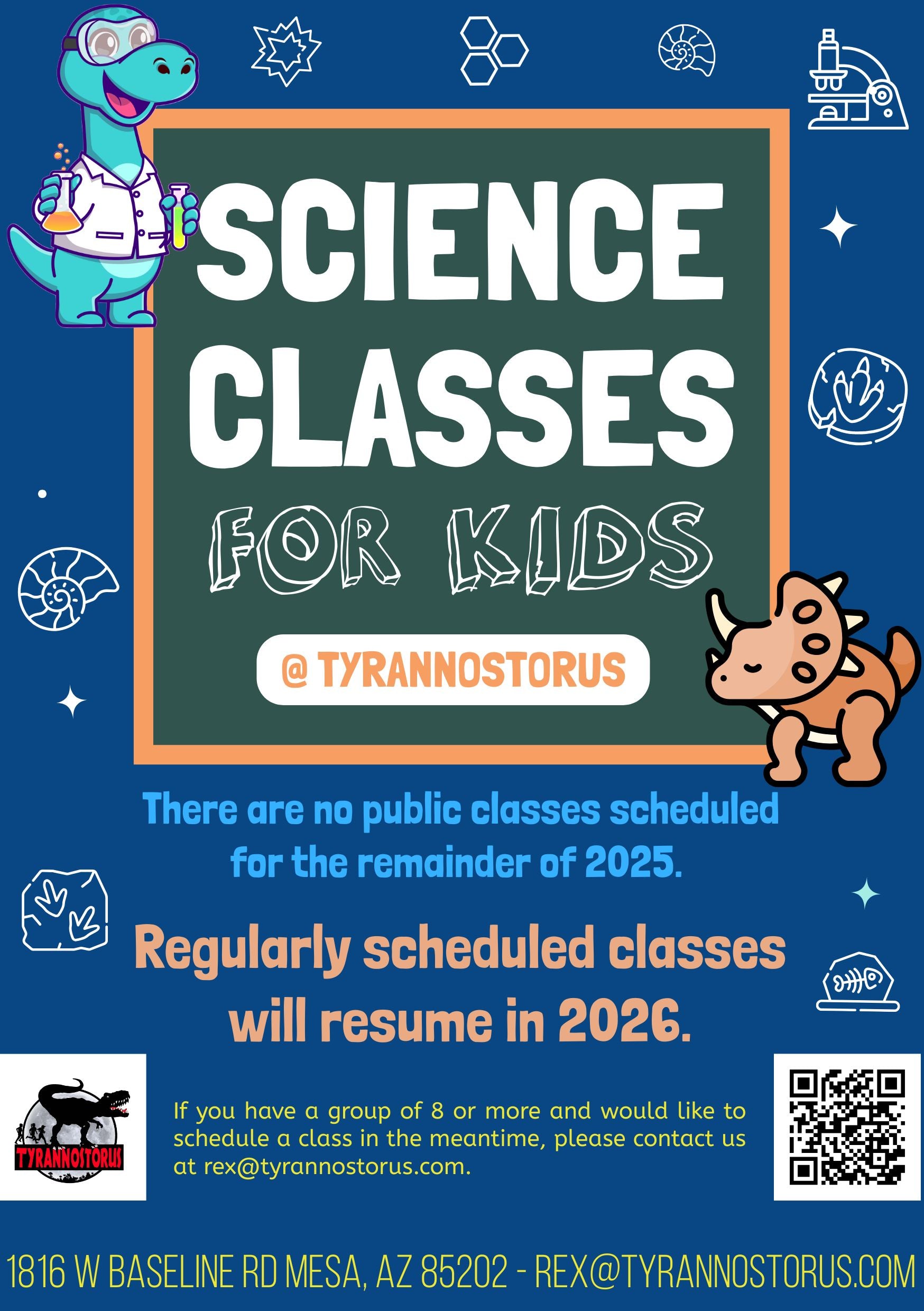Join us at Tyrannostorus for engaging science classes starting at $24.95. Classes include educational presentations, hands-on activities, and valuable keepsakes! Available classes and dates will be listed below along with links to register and pay online. Please note that there are not any public classes scheduled at this time. Regularly scheduled classes will resume in 2026. See the bottom of the page for a calendar view and class FAQs.