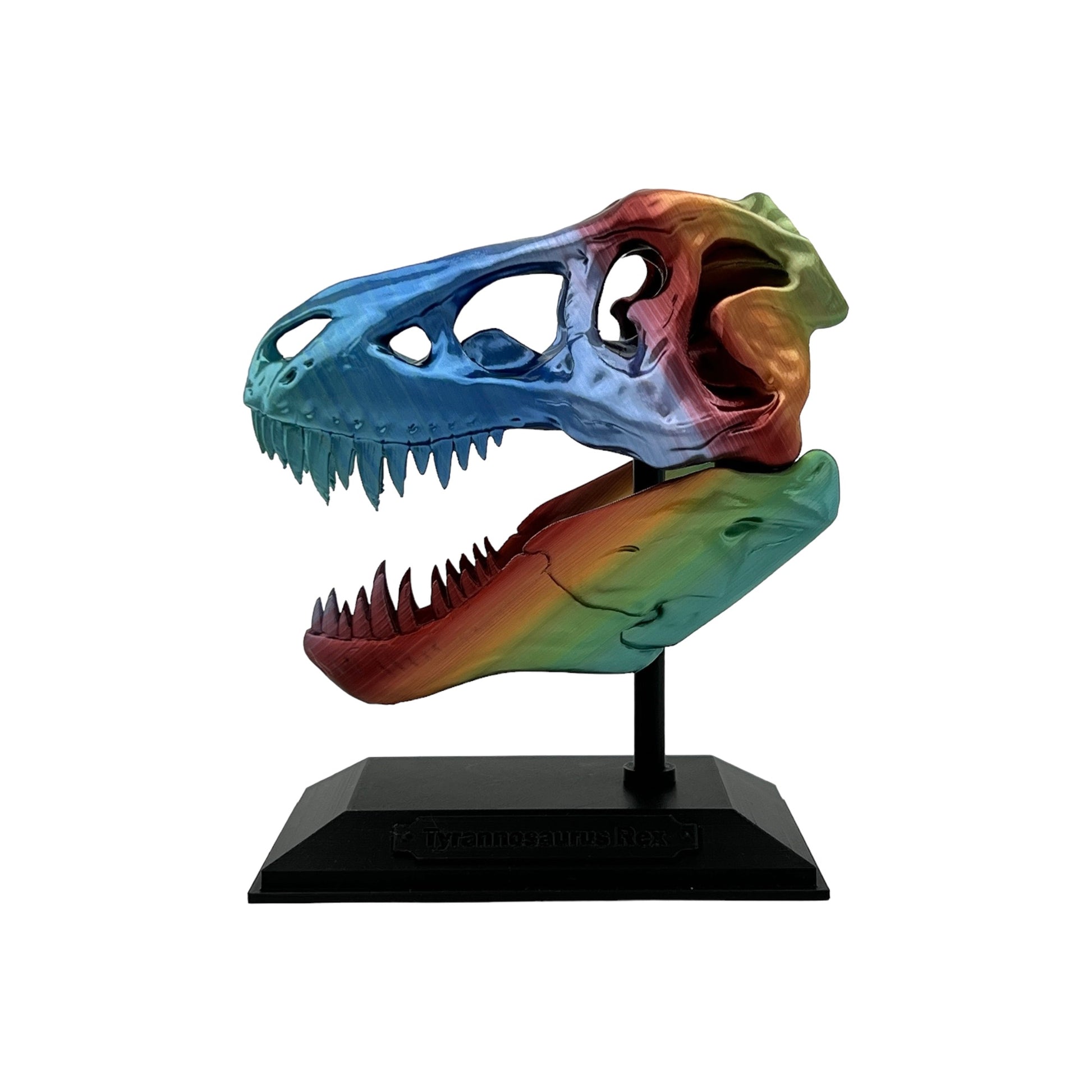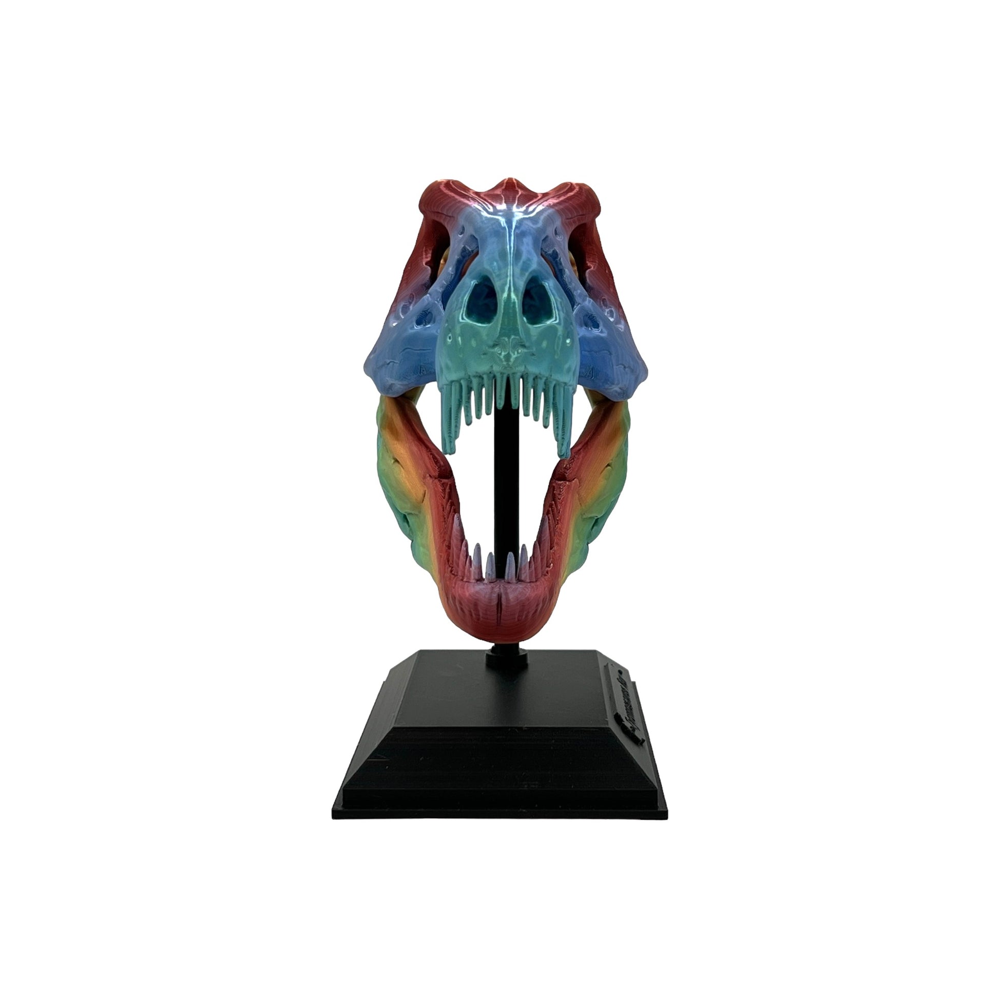 Behold the king of dinosaurs with our spectacular 3D Printed T-Rex Skull! This model captures the awe and majesty of the legendary T-Rex, featuring an intricate design and bold colors that will capture the imagination of dinosaur enthusiasts of all ages. The skull is 6 inches long and 4.5 inches tall. With the stand, it is approximately 7 inches tall!