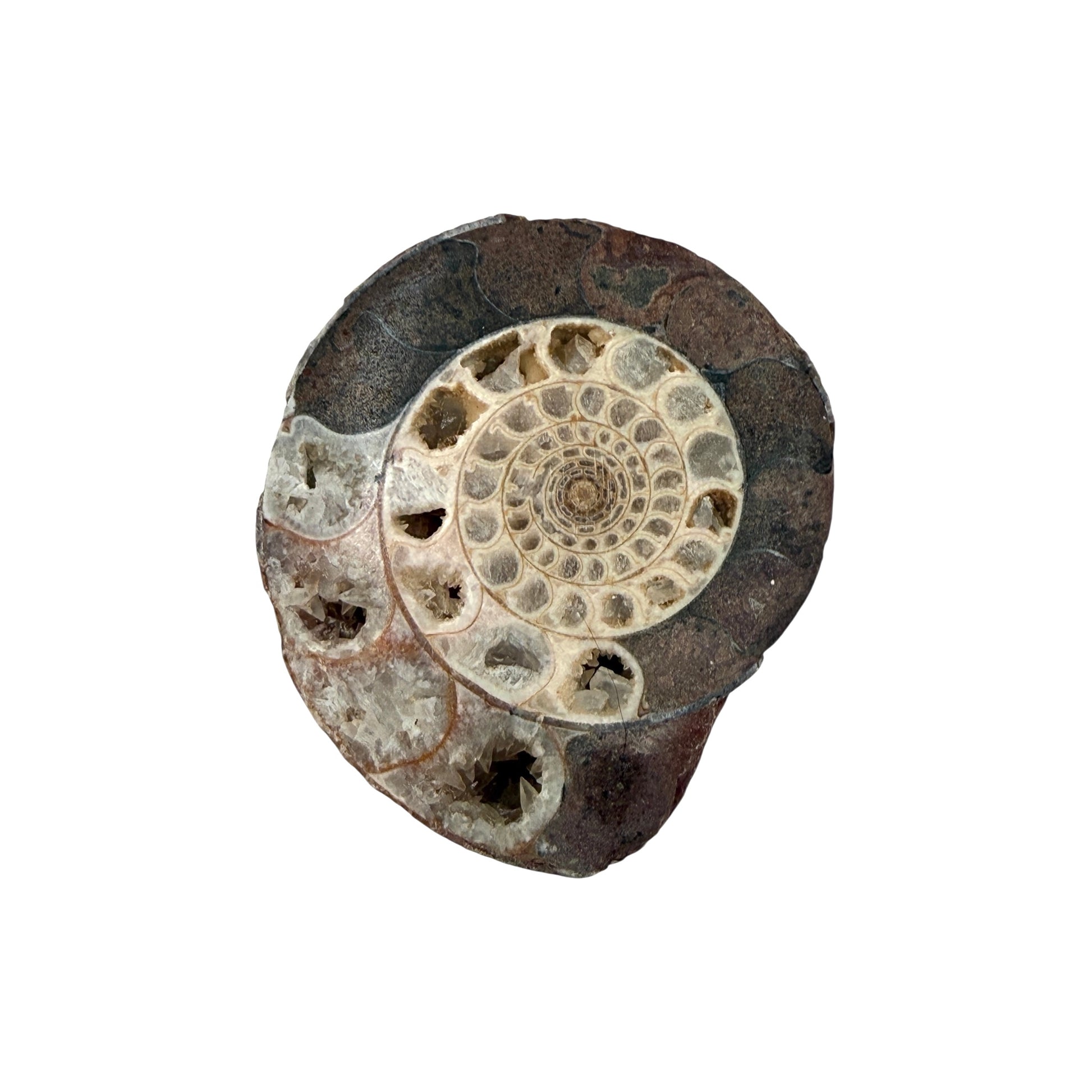 Discover a captivating piece of natural history with our Indonesian Ammonite featuring crystallized chambers. This remarkable specimen has been carefully sliced in half to unveil its intricate inner structure, where each chamber is beautifully lined with natural crystal formations.