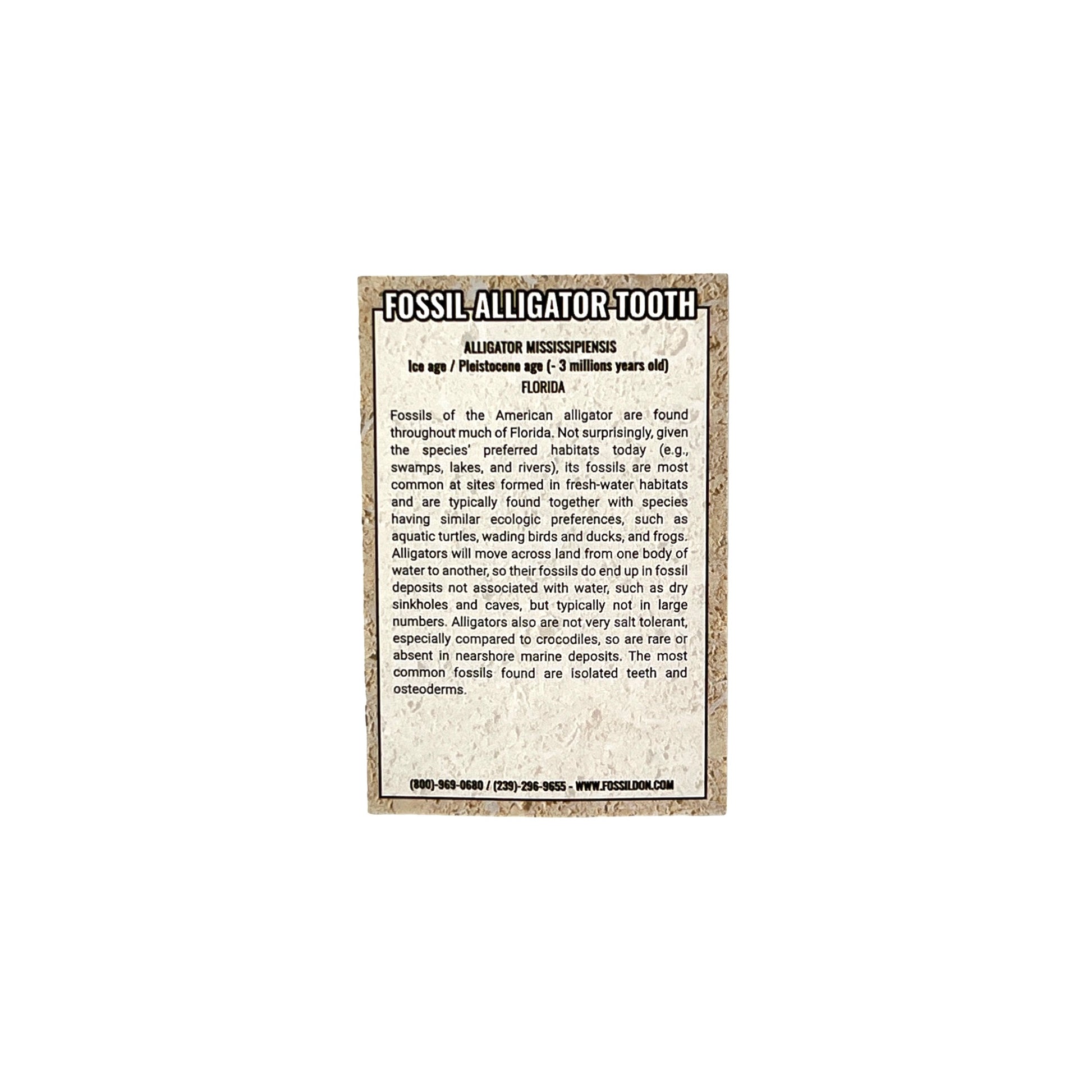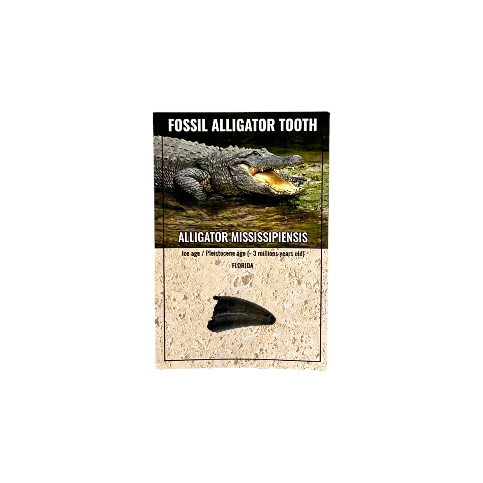 This Fossil Alligator Tooth comes from an American alligator (Alligator mississippiensis) and dates back 3 million years to the Pleistocene epoch. Mature alligators have 80 conical teeth and replace teeth that are lost. In fact, they might go through 2,000-3,000 teeth during their lifetime! This listing is for 1 fossil alligator tooth discovered in Florida. You will receive one of the prehistoric items pictured in this listing. Use the dropdown menu to select from available options. Each tooth is approximately 1 inch and comes with an informational card.