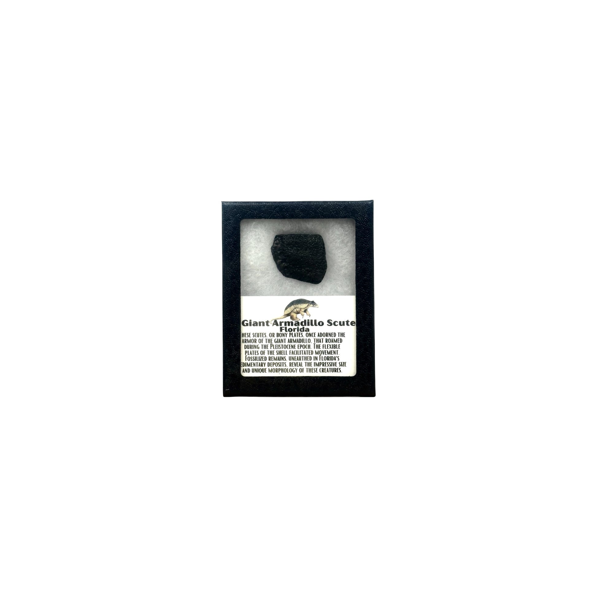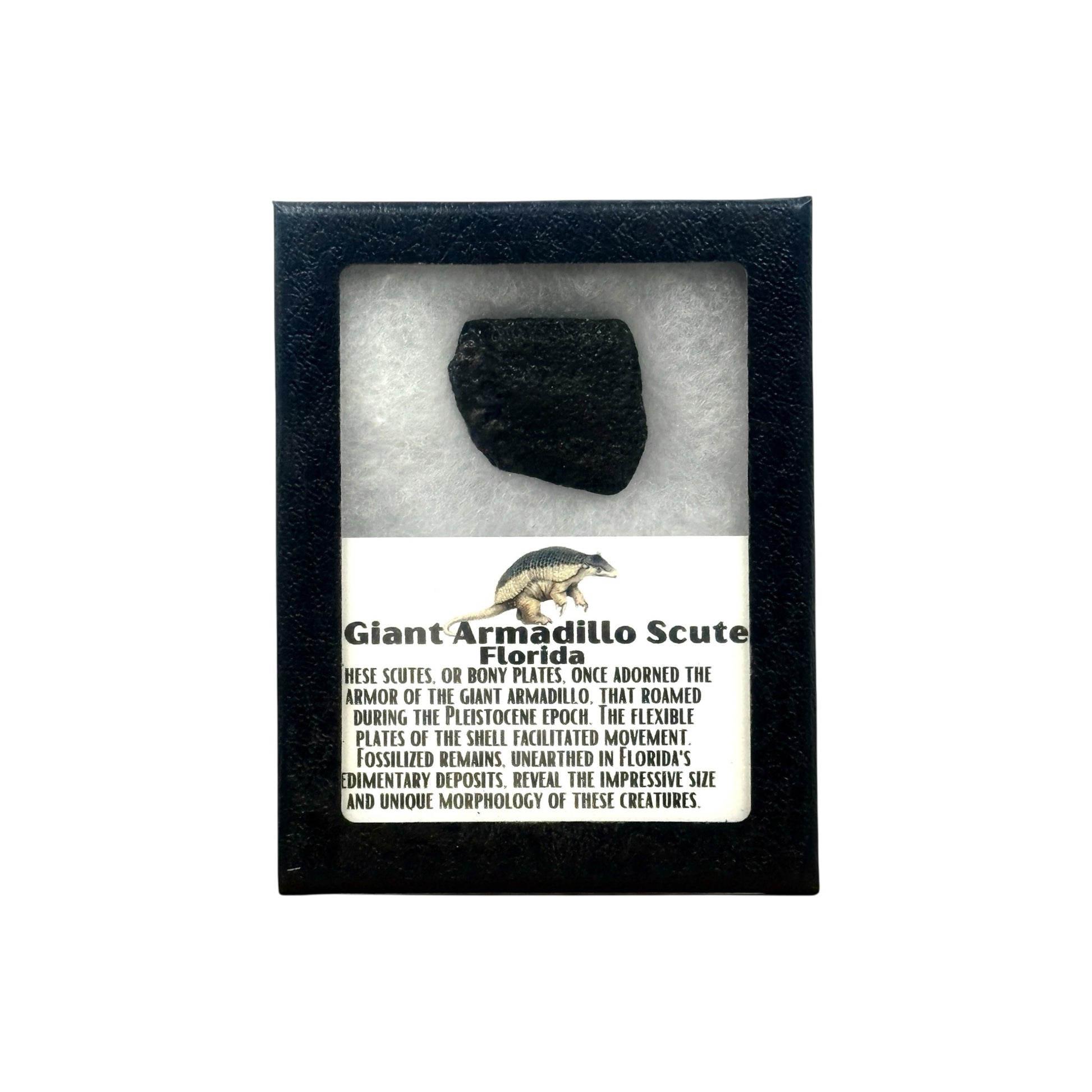 This display features a genuine fossil scute from a Giant Armadillo that lived during the Pleistocene epoch. Each specimen is carefully presented in a display box measuring 4.25 x 3.25 x .75 inches.