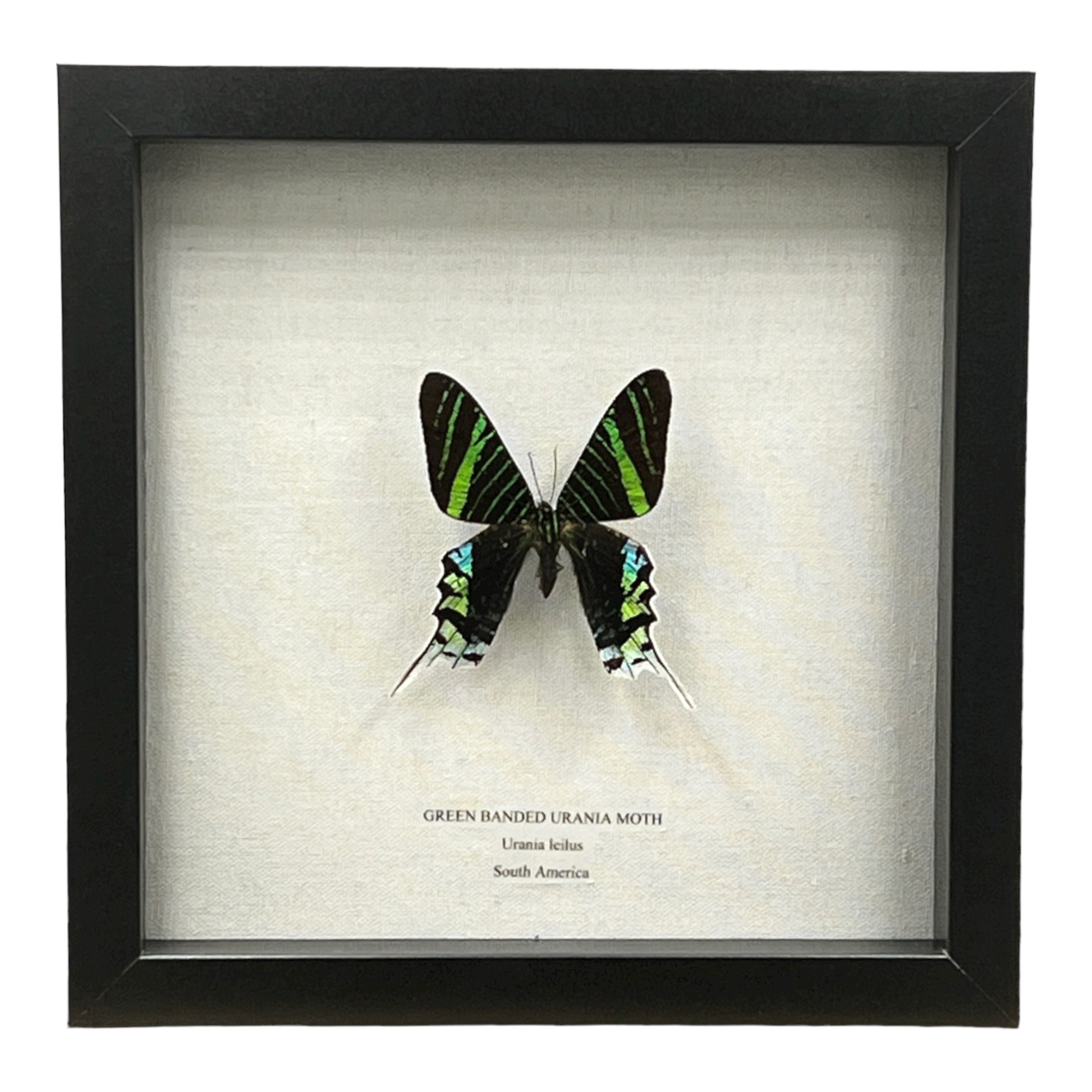 The Green Banded Urania is a day-flying moth found in South America. Its habitat includes riverbanks in the rainforest. It is characterized by brilliant green stripes on black wings that taper into thin points like tails as seen with this specimen. Our bug boxes are larger than most. The frames are 9" x 9" and feature beautifully preserved specimens mounted on a linen background in a wooden frame behind clear glass. All specimens have been ethically sourced. You will receive the bug box pictured in this listing. (The video is an example of a similar specimen displayed as home decor.) The photos reflect natural variances in lighting. Approximate measurements and additional details are listed above.
