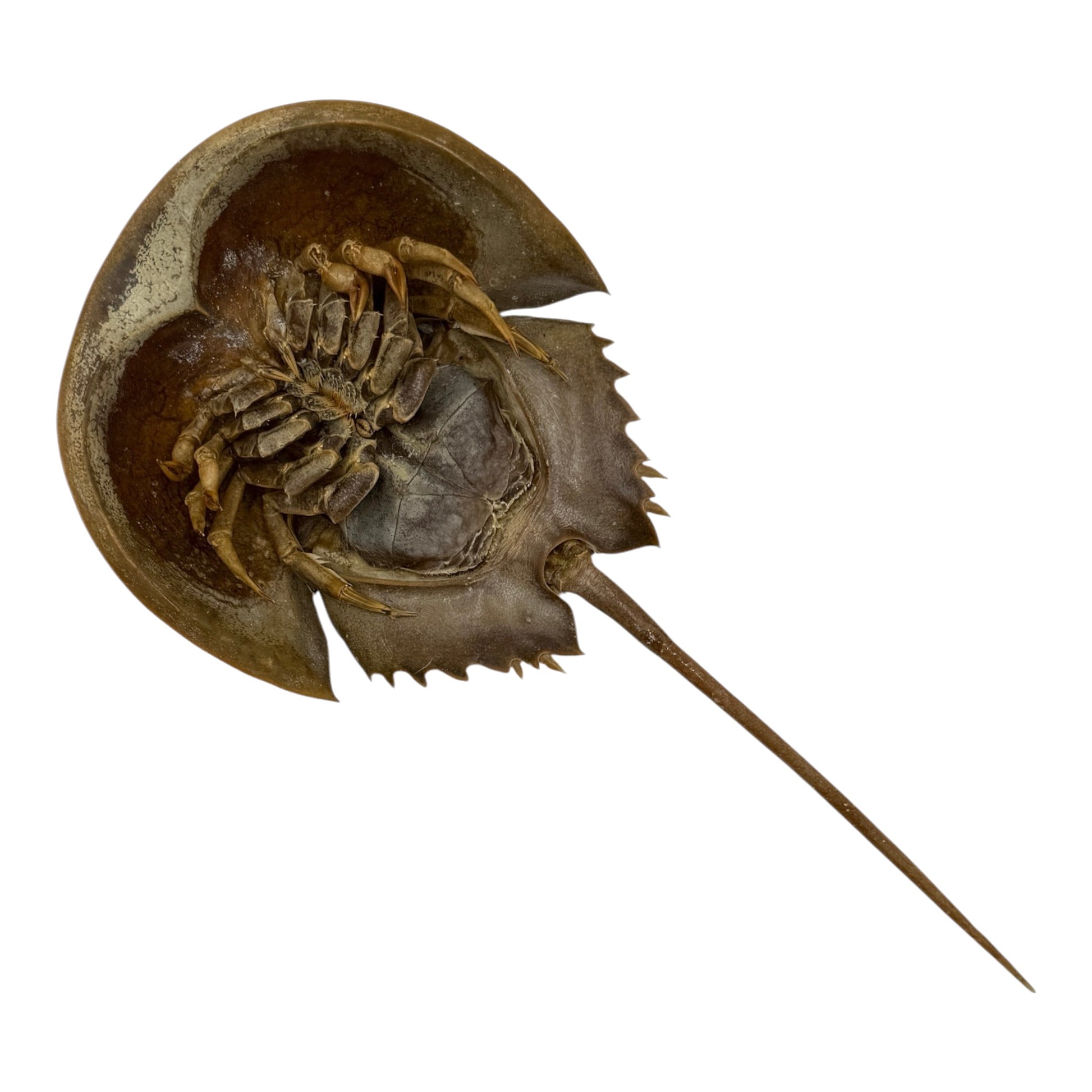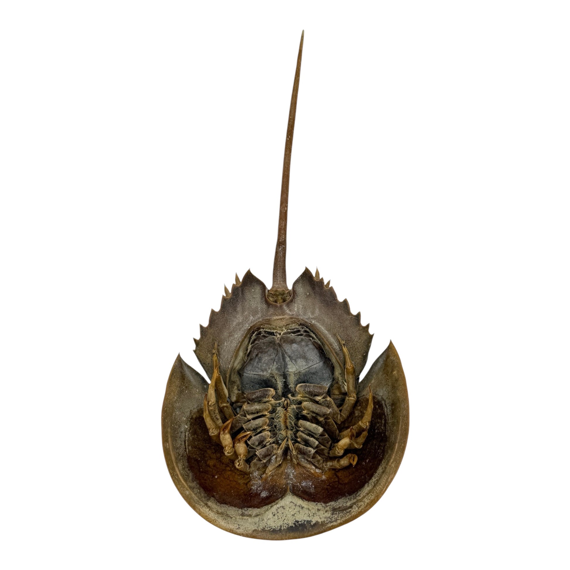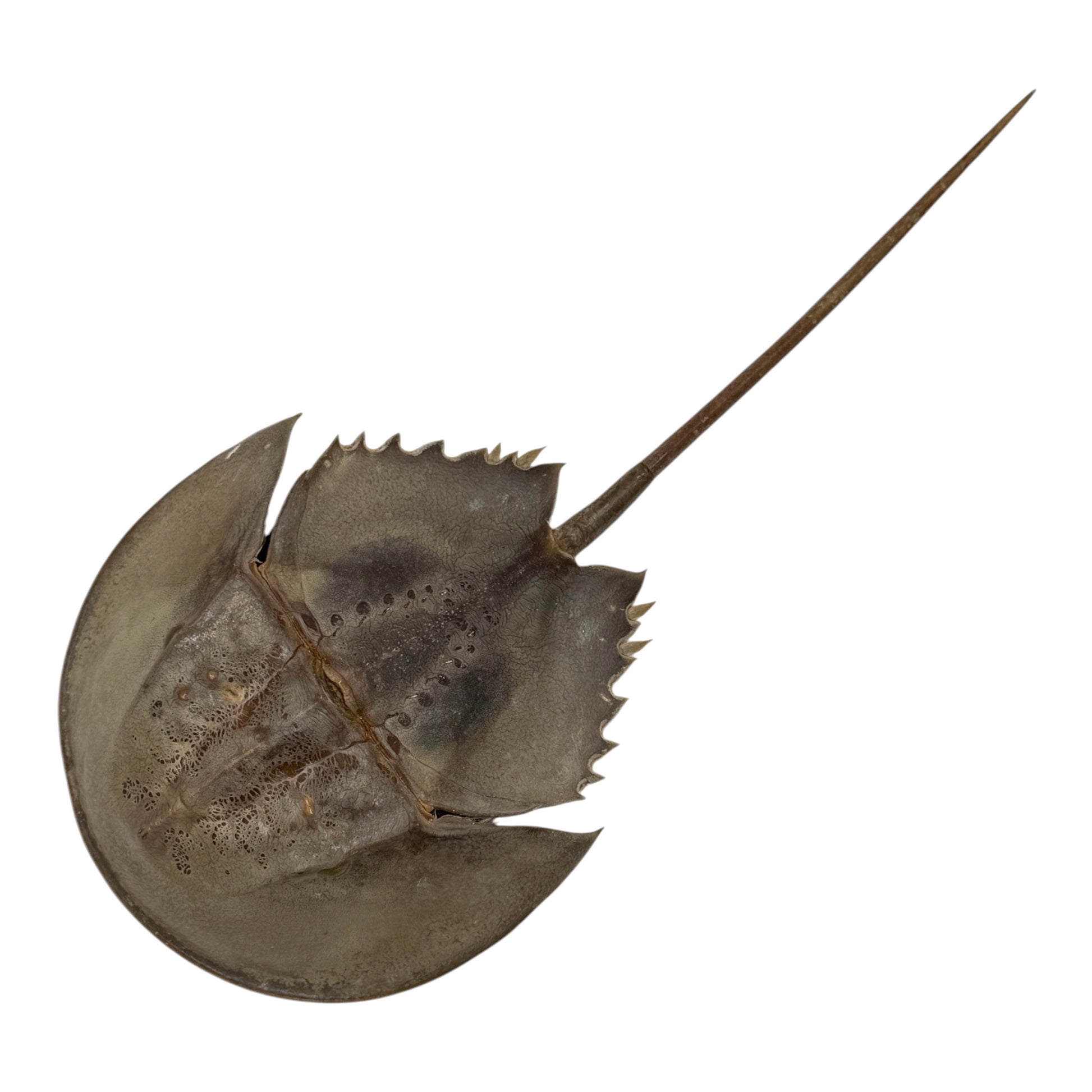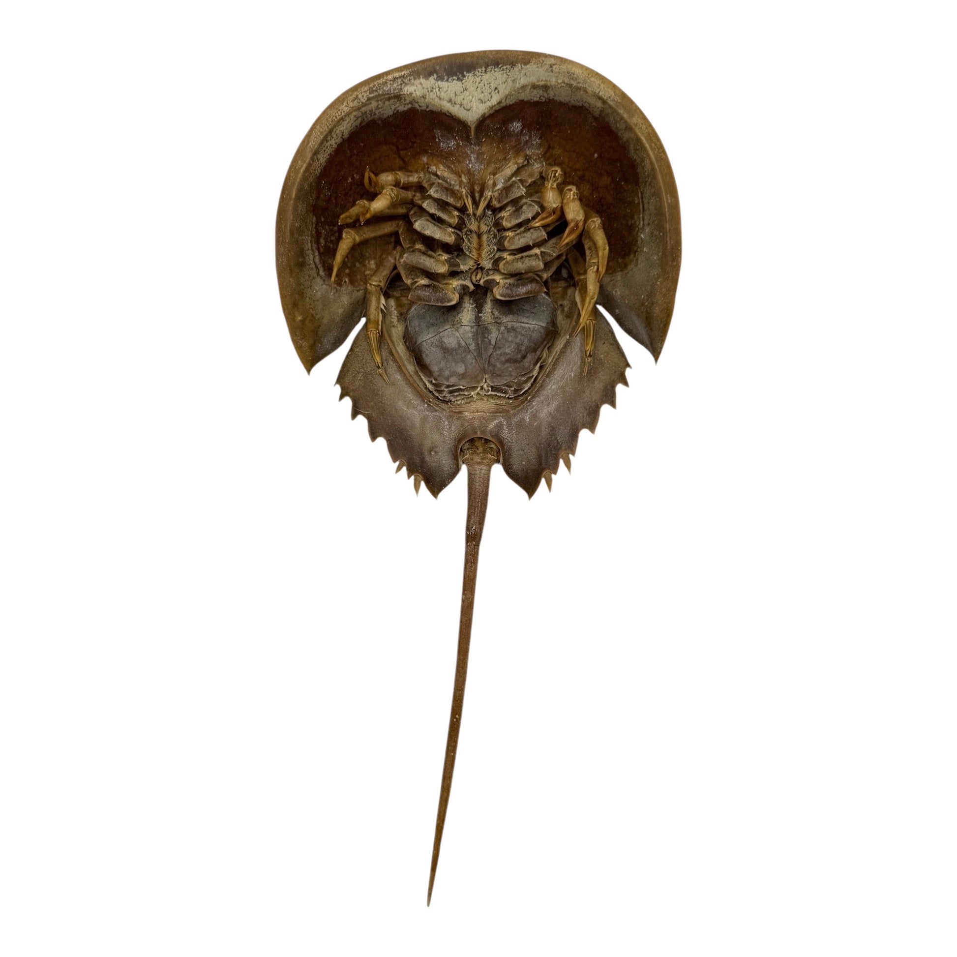Own a real horseshoe crab exoskeleton, ethically sourced and naturally shed during molting! These ancient creatures have existed for over 450 million years. Despite their name, horseshoe crabs are more closely related to spiders than crabs. Their blue blood is vital for medical research, helping ensure vaccine safety. Perfect for educational displays, marine enthusiasts, or unique decor. Pictures are representative of what you will receive, but each molt is unique, showcasing intricate details of this prehistoric species. Most molts have some legs but not all legs. For reference, the specimen pictured is approximately 4.25" wide and 9" long. A fascinating addition to any collection!