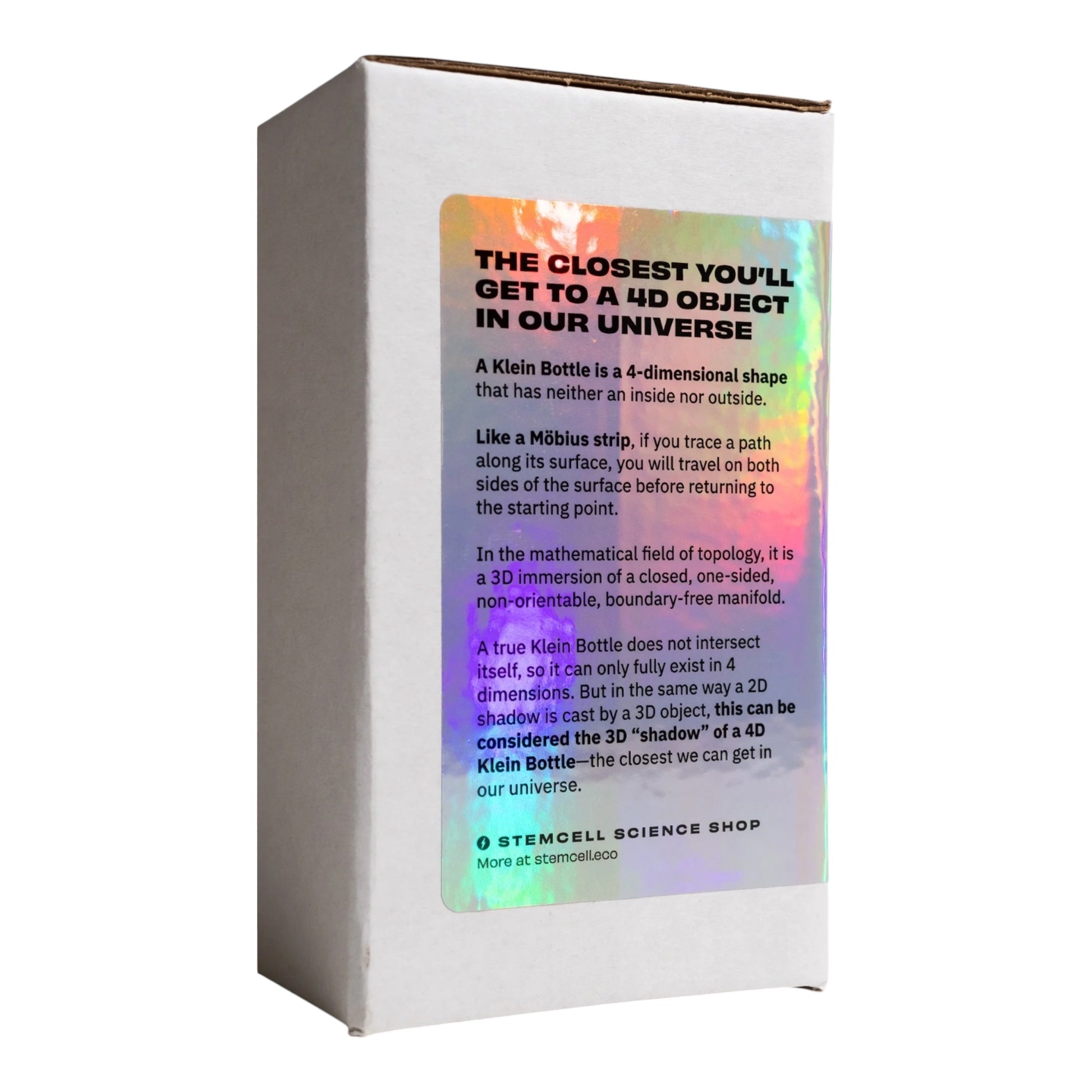 Like a Möbius strip, a Klein Bottle has no inside or outside—if you trace a path along its surface, you’ll travel on both sides before returning to your starting point. In topology, it represents a closed, one-sided, non-orientable, boundary-free manifold. While a true Klein Bottle can only fully exist in 4D space, this is its 3D “shadow,” a stunning representation of the concept.