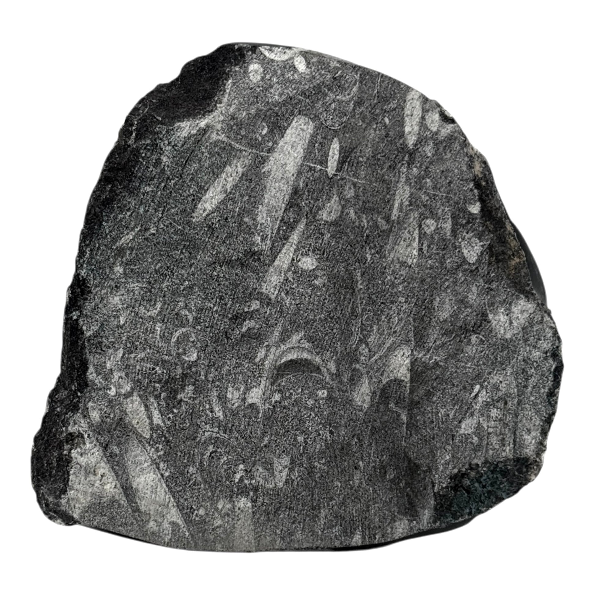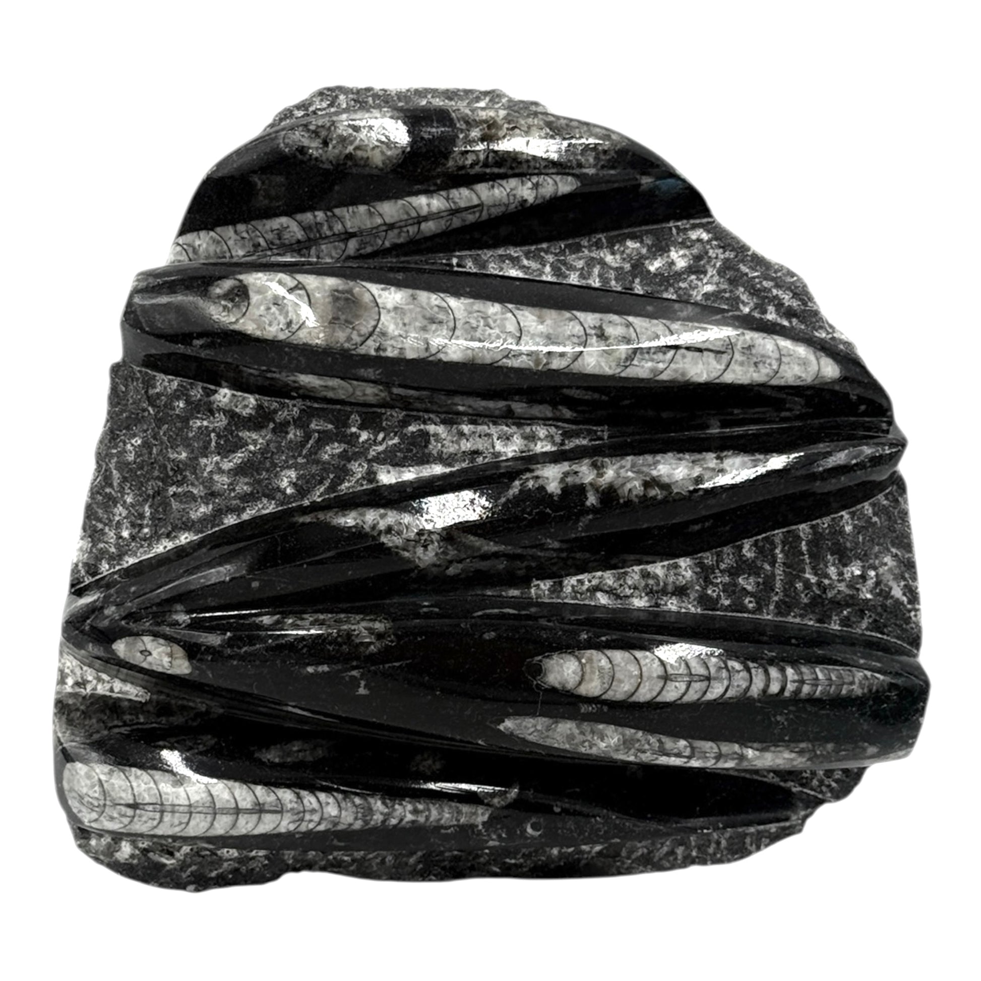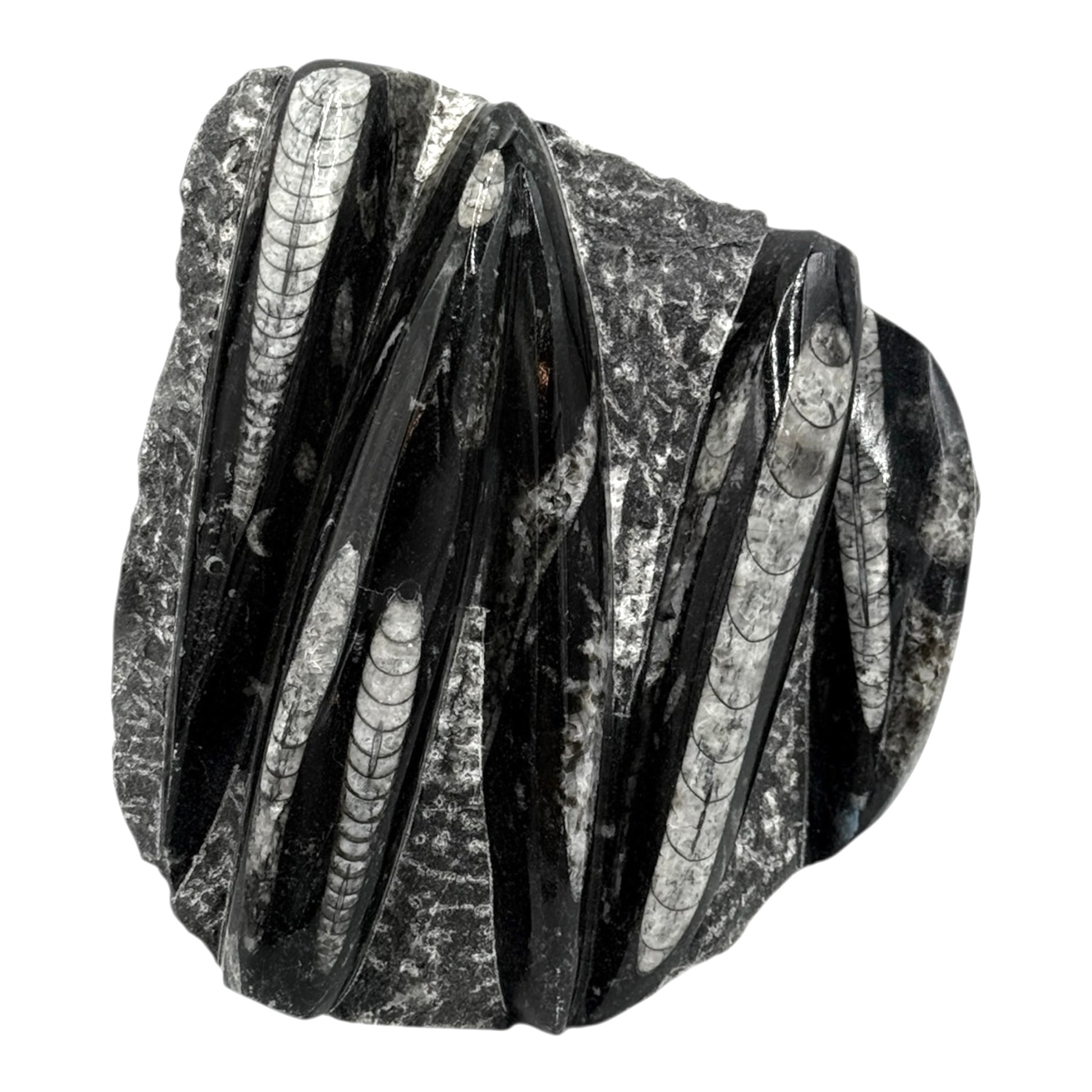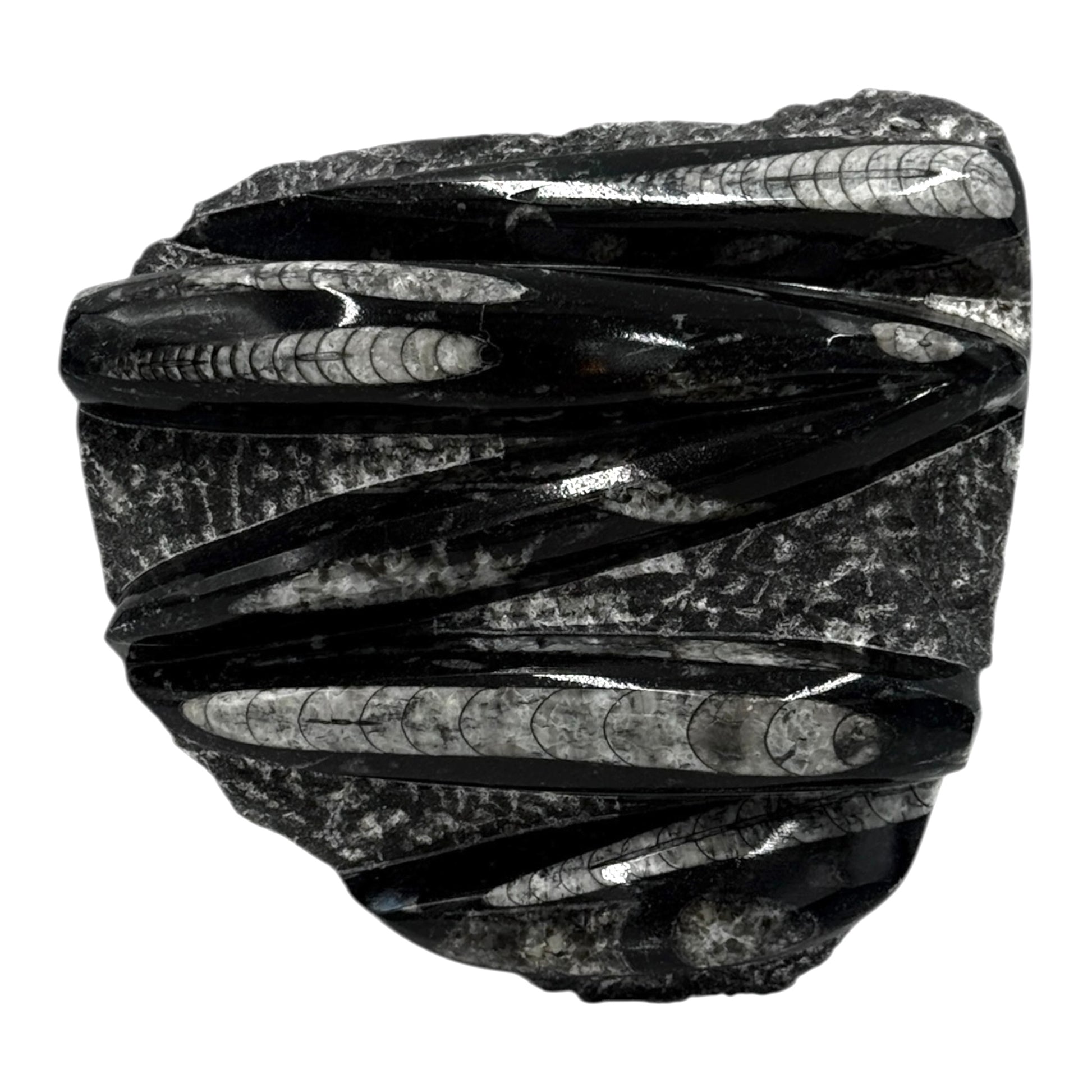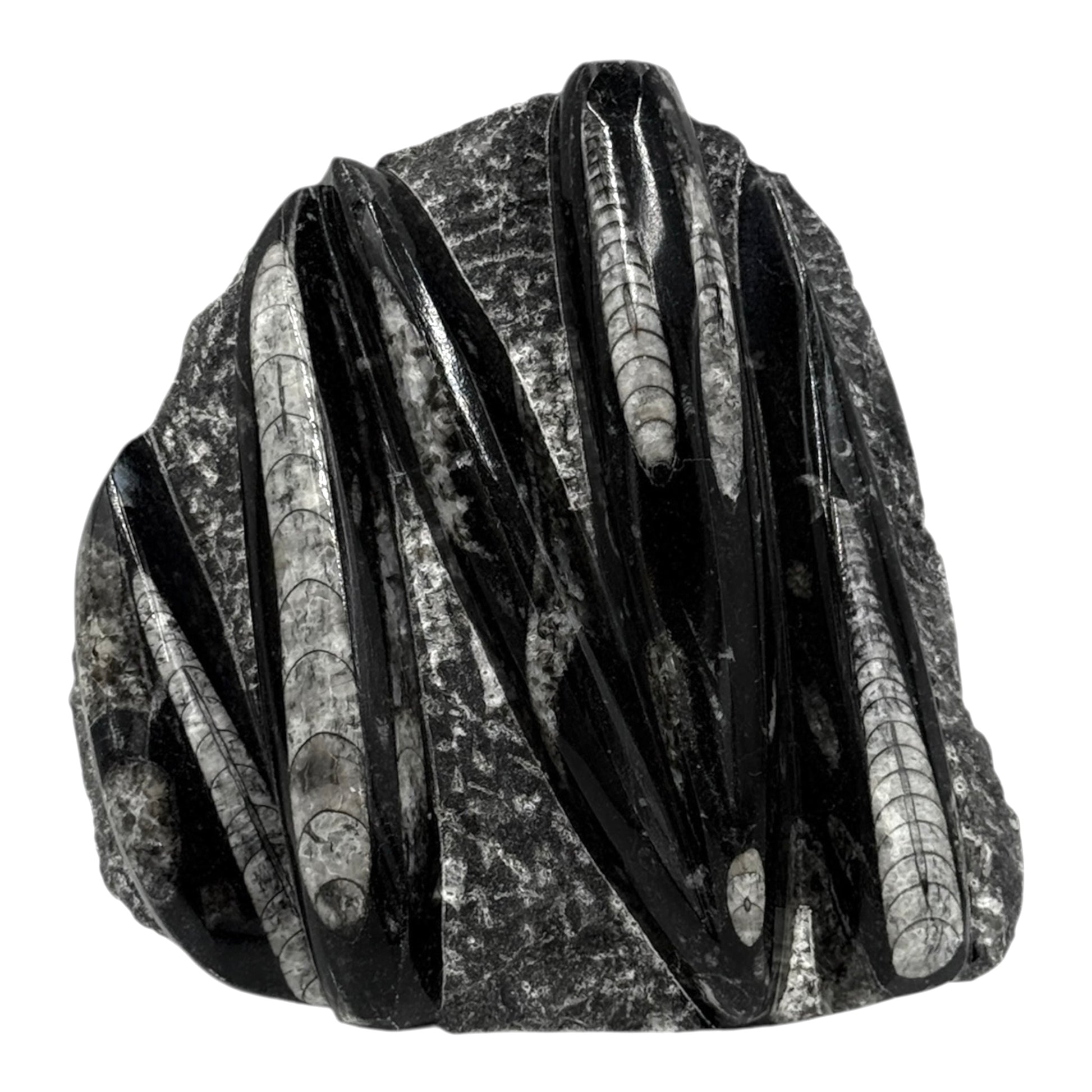 Orthoceras is an extinct genus of nautiloid cephalopods, ancient relatives of today’s squid and octopus, that lived over 200 million years ago in the prehistoric seas. Their sleek, cone-shaped shells are preserved in stone, creating stunning black and white fossil displays.