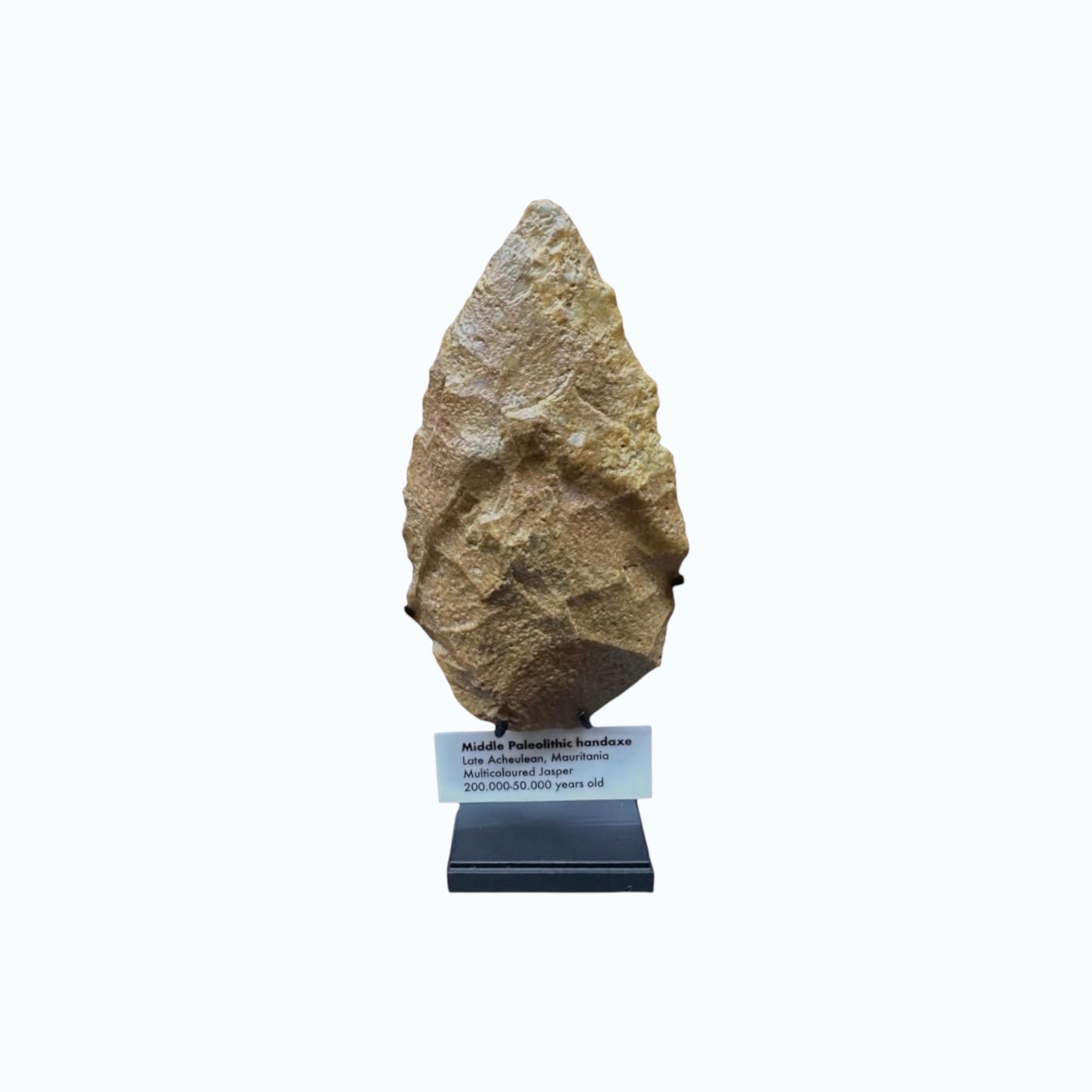 The large hand axe is labeled Acheulean and dates from approximately 700,000 to 120,000 years old. It is made of quartzite and associated with Atlanthropus mauritanicus, an early hominin identified in North Africa. This impressive piece measures approximately just over 5 inches wide and stands 10.5 inches tall including the display stand.