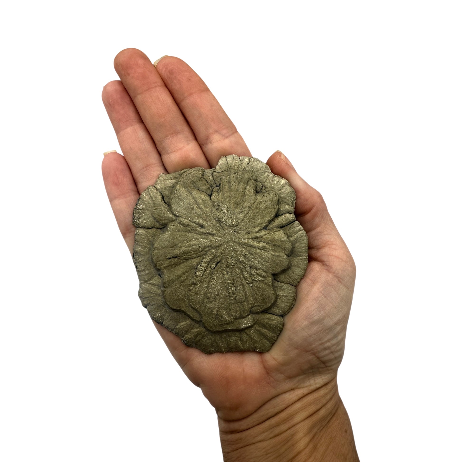 This listing is for one genuine Pyrite Sun measuring approximately 3–4 inches across. Also known as Pyrite Dollars, Miner’s Dollars, or Sun Dollars, these striking golden disks are natural crystal formations. They are not fossils, though they may resemble ancient plants.
